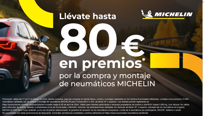 Del 21 octubre al 17 noviembre por la compra de 2 o 4 neumáticos Michelín para turismo, sub o 4×4 obtén un bono de hasta 80€ en combustible en tarjeta el Corte Inglés o tarjeta Decathlon.